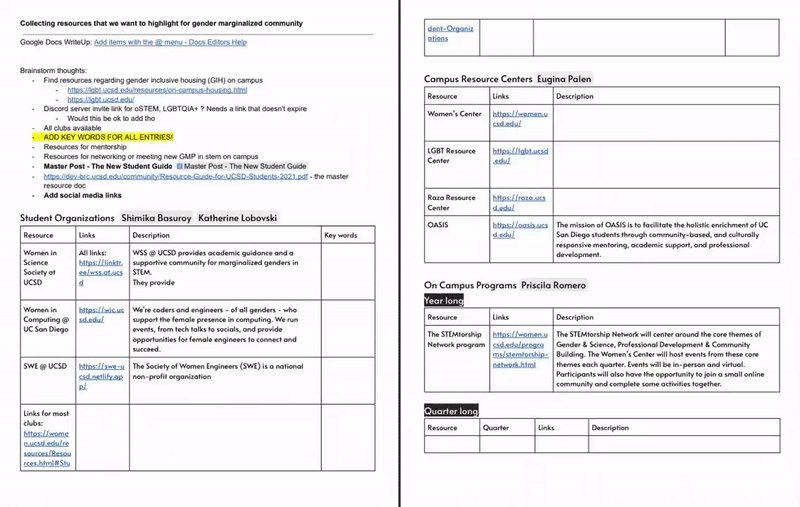 To address the lack of resource visibility for gender-marginalized students, we worked on curating a resource guide with updated links, descriptions and contact for active groups and campus organizations.